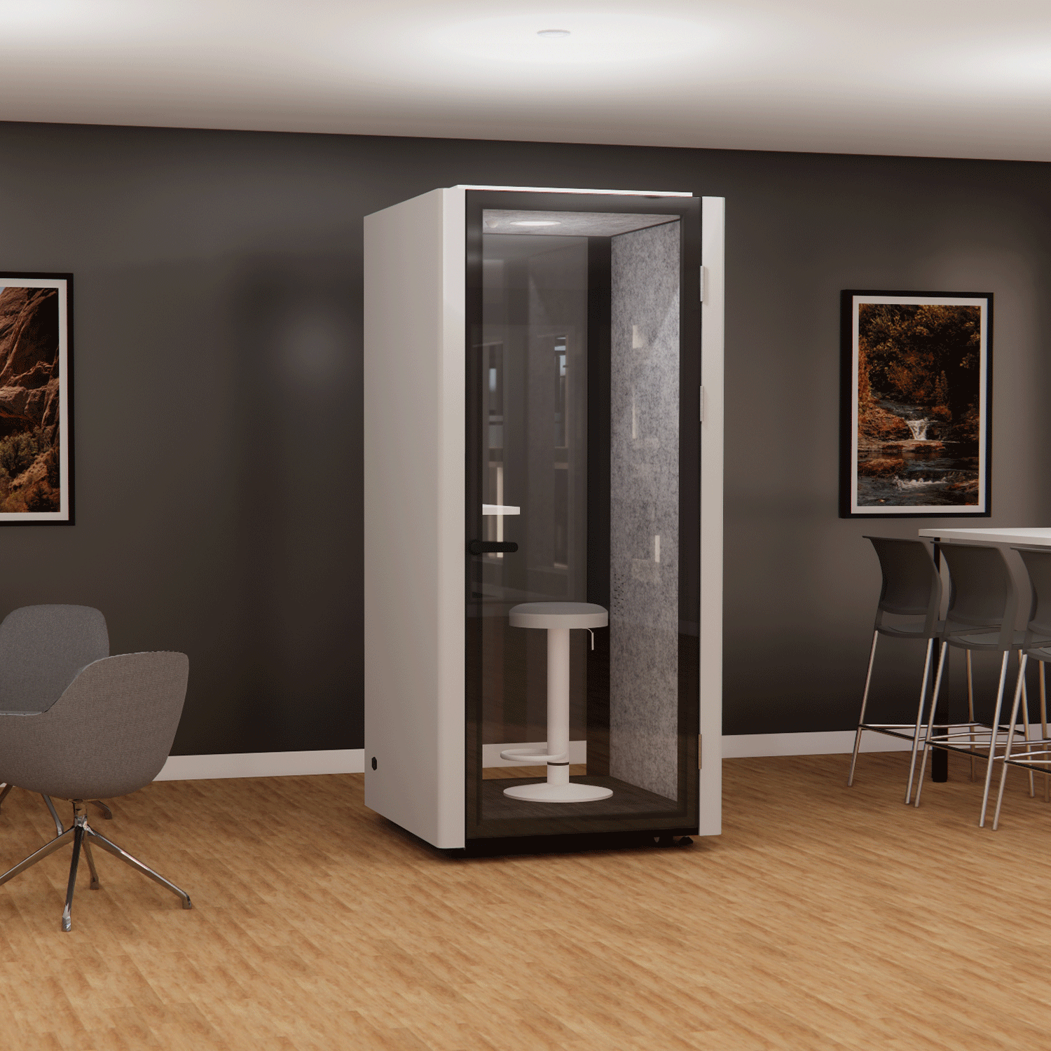 Create a quiet, private space for meetings or conversations with this Acoustic Booth Set. Featuring a sound-reducing shell, grey leather finish, and built-in table, it’s ideal for stylish, focused collaboration.