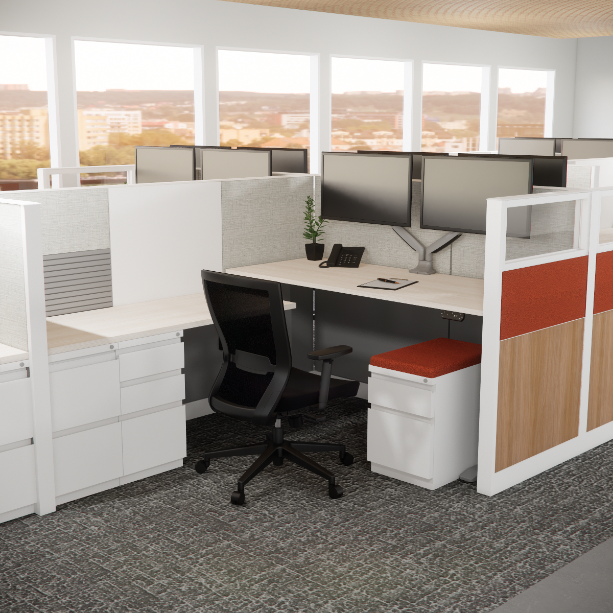 Upgrade your workspace with Steelcase Answer cubicles—6′ x 5.5′ workstations designed for style and efficiency. Featuring glass stackers, thin trim panels, and smart storage, these non-powered setups blend functionality with modern design.